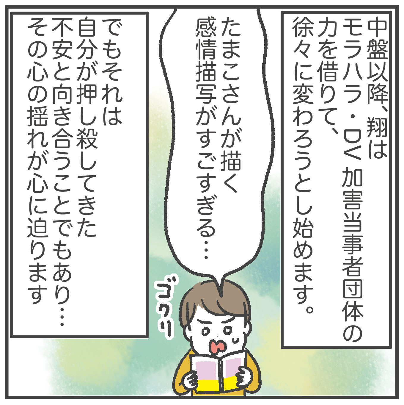 私は仕事関係の人だったのでそこまでではなかったですが、生活を共にする家族のことだとなおさら、他人の目もないし、その歪さに気づけないこともあるのかなと思います。
