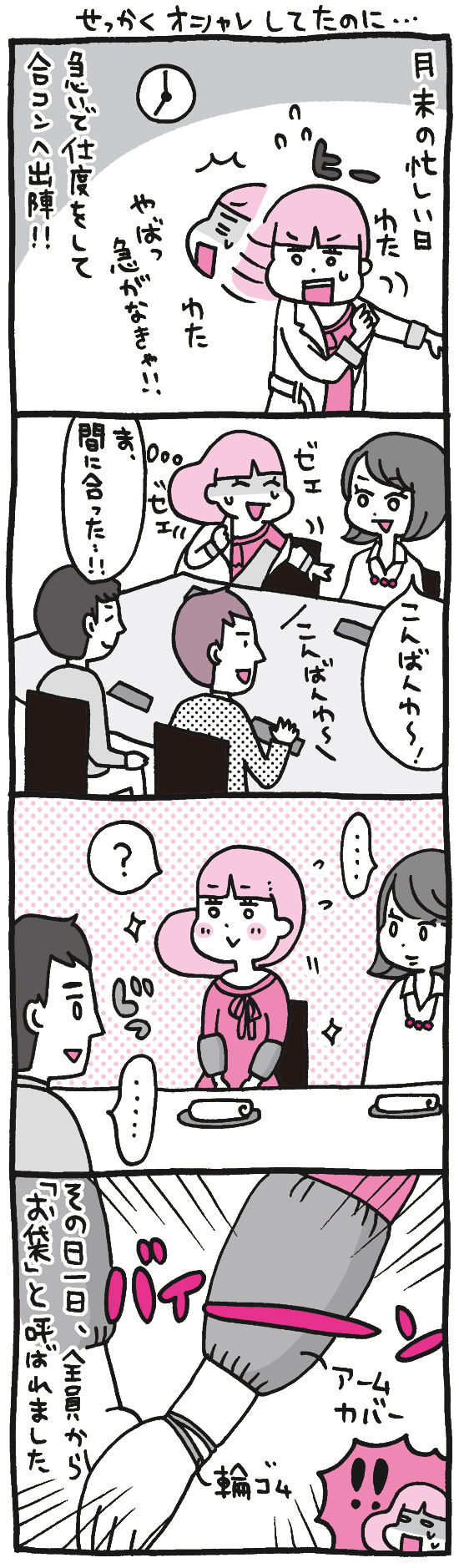 2016年01月31日 せっかくオシャレしてたのに… カテゴリ : OLマンガ「しくじりヤマコ」 ☆第一話はこちらからどうぞ☆第144話 せっかくオシャレしてたのに…この事務用アームカバー、個人的にすごく好きで集中して作業したいときや、料理や食器洗いの時に無いとすごく嫌なのですが(ださい花柄で15cmくらいの短いやつを愛用しています…笑)これを使っている人っ