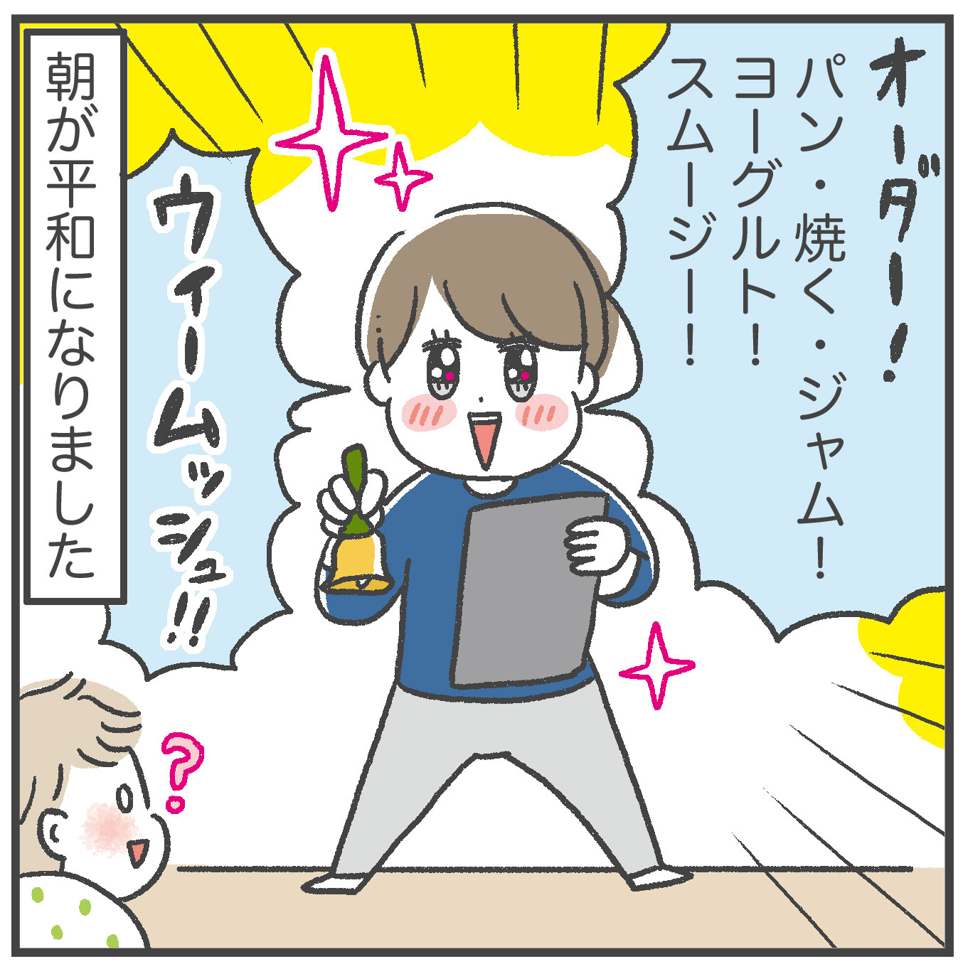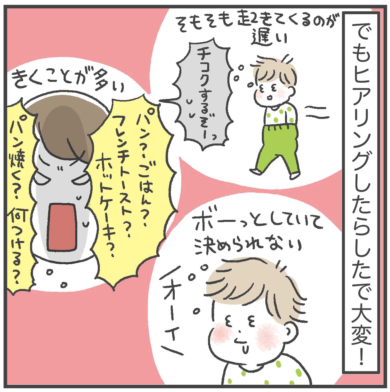 うちでは選択肢はパンのみですけど、それでも「焼くor焼かない」「甘いパンorしょっぱいパン」「切る?or切らない?」「飲み物は R1 or ミロ」と聞くことたくさんなのに、ボケーとしてて全然答えてくれなくて困ってます…口を開けたと思ったら「お菓子も一緒…」いやその前に朝ごはん決めてくれー!ってなってます。うちにも導入したいけど、えっ?それ?今日はむり!ってなりそうで取り入れられない…笑