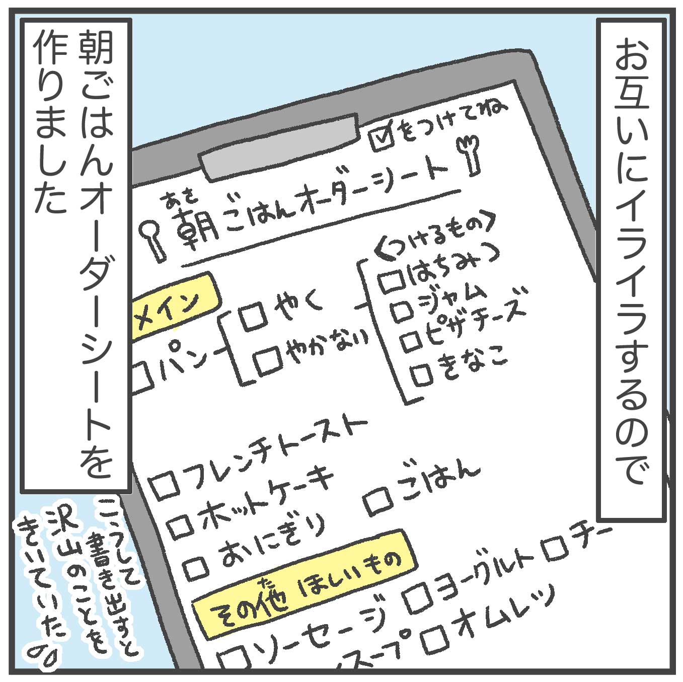 うちの5歳児も朝ぼーっとして何個も聞いてられないので、付箋に今出来る朝食を書いて冷蔵庫に貼っています😂