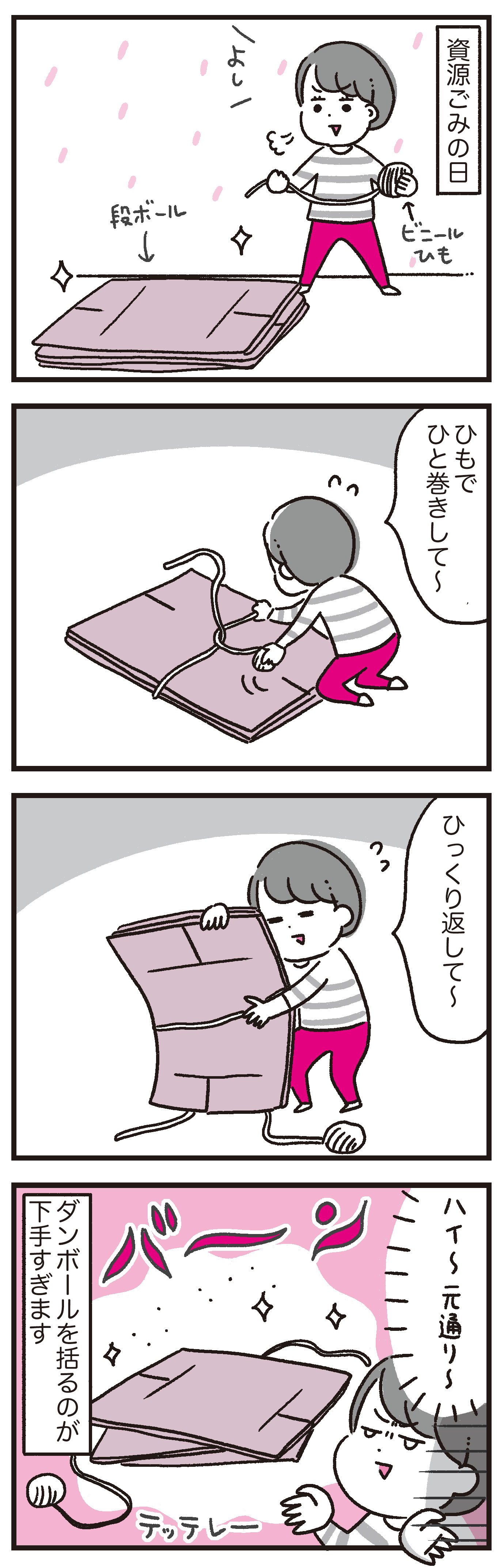 大きめの段ボールなら、半分に足で踏んで折りたたんで、紐を縛るとき、十字にしたところにガムテープを3つ貼ってずれないようにして裏を返して縛っています。