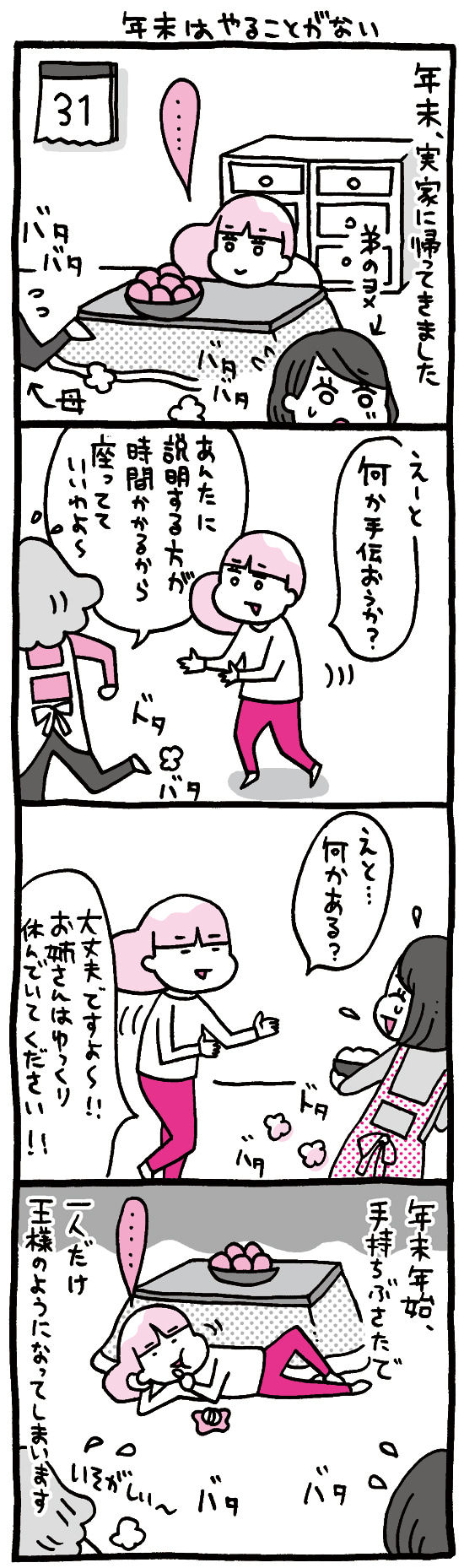 年末はやることがない 2015年12月28日 第127話 年末はやることがない-----ブログランキングに参加中です▼クリックで応援いただけたら嬉しいです☆----- 「OLマンガ「しくじりヤマコ」」カテゴリの最新記事 < 前の記事次の記事 > コメント コメント一覧 (14) 1. 音☆ 2015年12月28日 22:25 暇すぎてまたコメントします(笑) すごいわかる!年末年始ぐーたらしまくりですよ~ 予定欲しいです(;_;) 0 akibasayaka がしました 2. ゆみ男 2015年12月28日 23:08 こんばんはぁ~♪ ゆっくり休むことが仕事ですよ! 私は元旦から出勤です~(笑) 0 akibasayaka がしました 3. しぃチャン★ 2015年12月28日 23:33 お母さんの返しに笑ってしまいました《*≧∀≦》 ヤマコさん今年はしっかり!!(笑) 0 akibasayaka がしました 4. vanillemarine 2015年12月29日 14:41 お母さん!!笑 でもいい環境ですね♪うちは実家に帰るってことはないですが、たまに実家に帰ると何もしません。動きもしません。 実家はパラダイスや!!笑 素敵な年末年始をお過ごしください♪ 0 akibasayaka がしました 5. shikujiriyamaco 2015年12月29日 18:25 >音☆さん そうですよねーー! 仕事中はぐうたらするの楽しみなんですが、実際すると…暇ですよね笑 0 akibasayaka がしました 6. shikujiriyamaco 2015年12月29日 18:28 >ゆみ男さん こんばんはー! ゆっくり休むことが仕事…素敵なお言葉ありがとうございますー!( ´艸`) なんも元旦からですかー!!お疲れ様ですー!! 0 akibasayaka がしました 7. shikujiriyamaco 2015年12月29日 18:35 >しぃチャン★さん お母さん… その通りだけどもっとなんか言い方ないのか…って感じですよね笑 今年は頑張れヤマコ!!笑 0 akibasayaka がしました 8. shikujiriyamaco 2015年12月29日 18:42 >vanillemarineさん 名言!笑 本当実家はパラダイスですよね!笑 私もコタツが指定席です( ̄▽+ ̄*) vanillemarineさんも良い年をお迎えくださいませー!♡ 0 akibasayaka がしました 9. GO!えぃみぃGO! 2015年12月30日 18:20 おとといヤマコさんを知って、その面白さに一気に全部読みました⭐️ 年末年始に帰省してゆっくりするのが楽しみなのに、今回弟が嫁さん候補という他人を連れて来るとかで、ゆっくりできないのが辛い…泣 0 akibasayaka がしました 10. もとちゃん 2015年12月30日 18:54 ヤマコさん♡ 私もヤマコさんのマンガに最近はまり、楽しみにしています(*^^*) いつも声に出して笑ってしまいます 来年もたくさんマンガ読ませてくださいね~ 良いお年を!! 0 akibasayaka がしました 11. shikujiriyamaco 2015年12月31日 11:31 >GO!えぃみぃGO!さん わおー全部読んでいただいたのですか!?嬉しいですー(ノ_・。) そうなんですよねー… さすがに義理の妹候補の前でだるんだるんのぐだぐだ状態にはなれないですよね…笑 ファイトですー(;^_^A 0 akibasayaka がしました 12. shikujiriyamaco 2015年12月31日 11:33 >もとちゃんさん ありがとうございます!!! すごく嬉しいですー♡ しょうもないネタばかりではありますが、来年もどうぞよろしくお願いいたしますー!(^∇^) 良いお年を♡ 0 akibasayaka がしました 13. mary 2016年01月05日 08:16 嫁の立場をだと、こういうたまに帰ってきてひたすら休む人って、腸が煮えくりかえるくらい腹がたつ。何を手伝えばいいとかって、あんたの実家なんだから自分で仕事を見つけて働けよ! こっちは食事をするのも気がひけるくらい心身すり減らして働いてんだぞっ! と毎年嫁の立場で思っています。 言えませんが。 0 akibasayaka がしました 14. shikujiriyamaco 2016年01月05日 10:22 >maryさん ひぇぇぇぇ ヤマコに変わってごめんなさい! お嫁さんもお嫁さんで大変ですよね。。 気を使うし、お嫁さんは座っていられないですもんね!そして当然そんなこと言えませんよね…分かります。お疲れ様です… 0 akibasayaka がしました コメントフォーム 名前 コメント 記事の評価 リセット リセット 顔 星 情報を記憶 コメントを投稿する