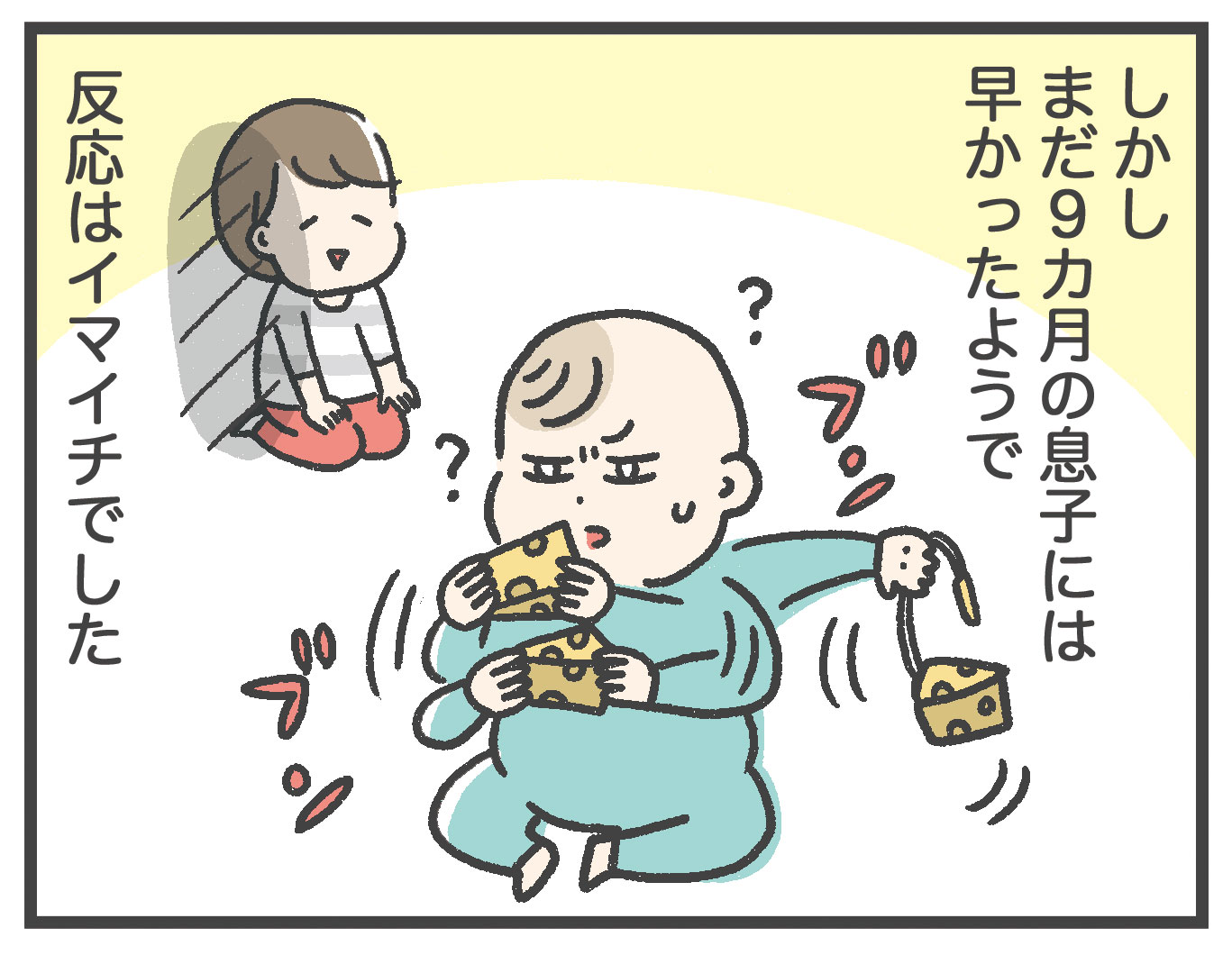 お母さんが「チューチュー♪僕ネズミ!チーズ食べたいなぁ〜」とか言いながらネズミを頭だけ出した状態にして、「わぁ〜抜けなくなっちゃった!助けて〜!引っ張って〜!」と言ってあげると、大抵の子供は引っ張ってくれます!