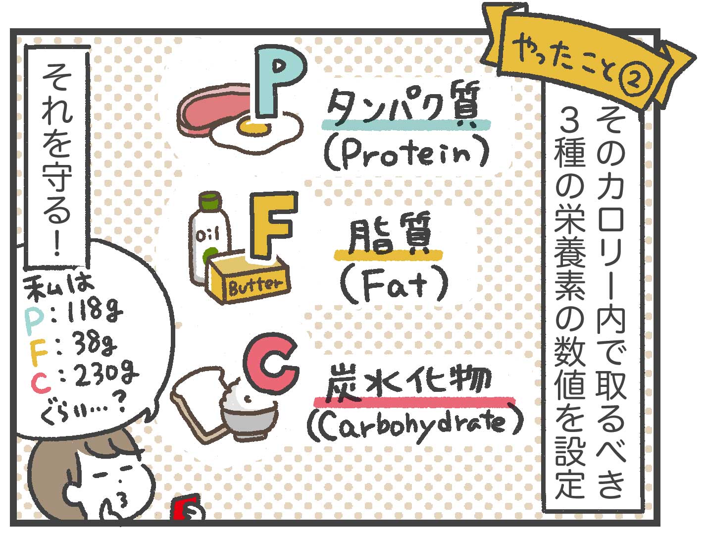 「食べるカロリーを決めて、その中で栄養素(PFC)のバランスを設定して守る。+筋トレ」