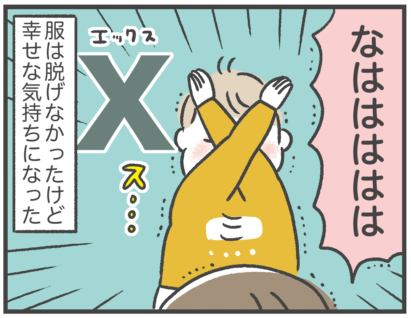 うちの2歳6ヵ月も服脱ぎの練習中です。エックス脱ぎはうちもうまくいきませんでした(おっくんみたいに面白いことは起きませんでしたが 笑)。