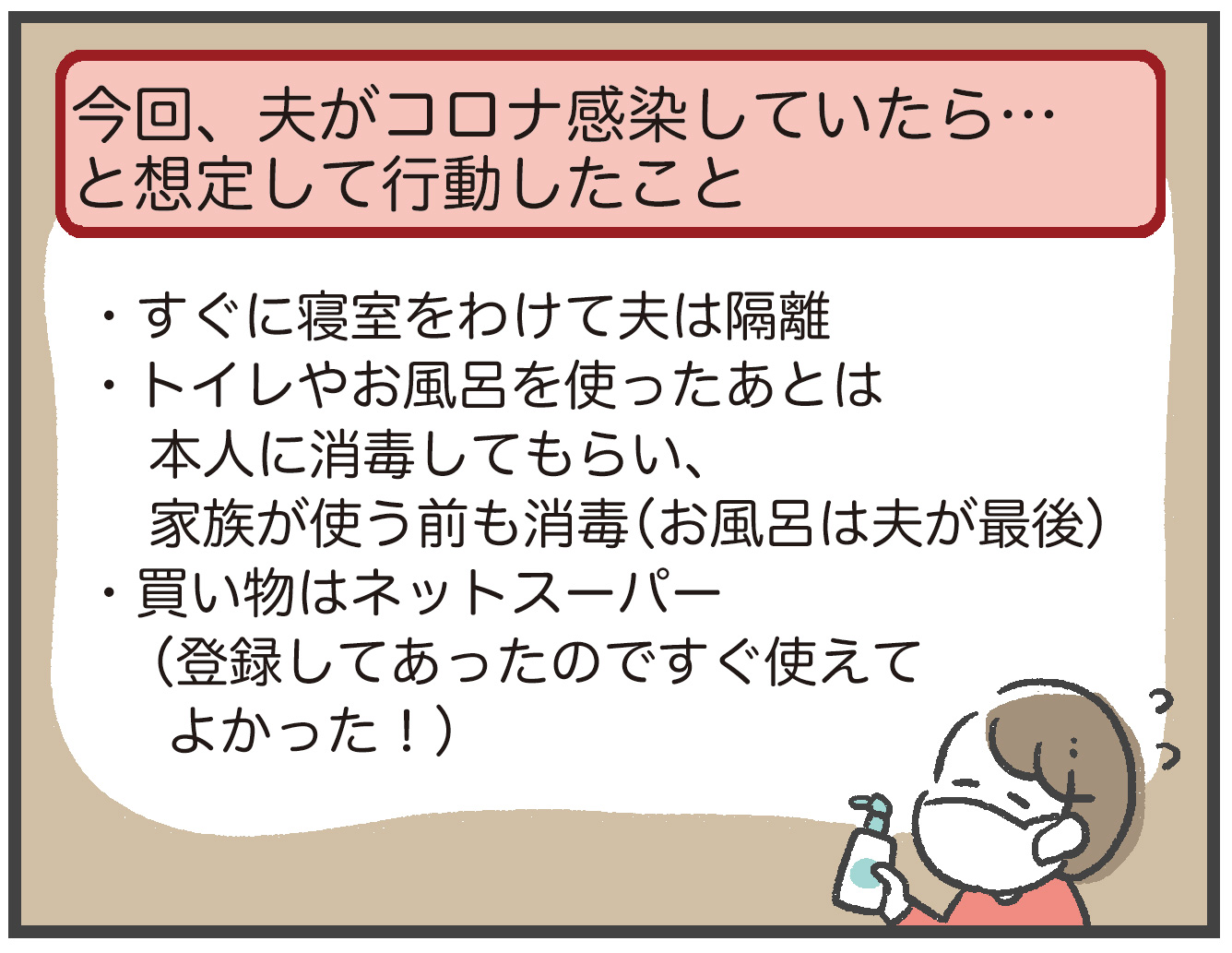 夫が感染者、私と息子が濃厚接触者と想定して生活してみて、感じたことをまとめました。